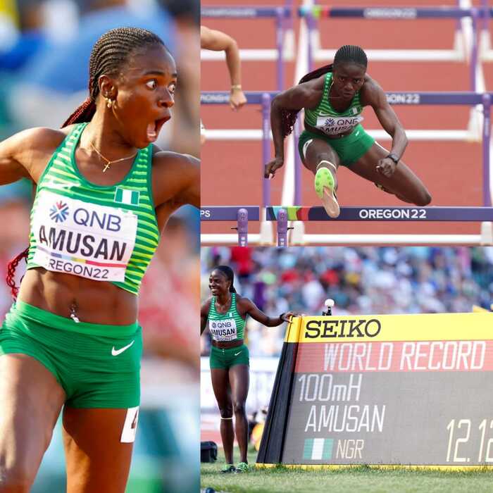 Не успели зрители успокоиться, как пришлось хлопать ладошками и кричать во весь голос еще раз – в финале бега на 100 с барьерами нигерийка Тоби Амюзан заставила время замереть на цифрах 12.06, что на 6 сотых превышало её же мировой рекорд 12.12, поставленный в полуфинале. К сожалению, попутный ветер превышал допустимую норму в 2 м/с (дуло с 2.5 м/с), но вряд ли это умаляет радость африканской спортсменки. Позади неё серебро от бронзы отделил лишь фотофиниш, и Британи Андерсон из Ямайки выиграла у Жасмин Камачо-Куин всего 0.005с (время призеров 12.23, тоже невероятно быстро).