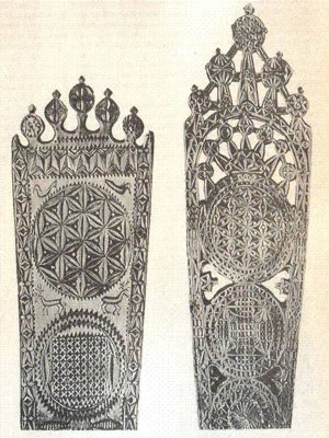 Поморские прялки, бытовавшие по берегам Белого моря, были густо украшены геометрической резьбой, а в XIX веке резьбу стали еще и раскрашивать, используя радостную многоцветную палитру красок. На них мы видим уже не одну, а три сложные розетки, расположенные одна под другой, причем в центральную обязательно вписан ромб или квадрат, часто со штриховкой. (Сейчас уже доказано, что изображение ромба с глубокой древности символизировало идею плодородия, плодоносящую землю. А вихревая розетка под ним — это ночное «подземное» солнце, совершающее свой путь с запада на восток, чтобы утром вновь осветить и согреть землю.) Оказывается, на прялках воссоздана схематичная картина Вселенной, состоящей, по мировоззрению наших предков, из трех основных миров — небесного, земного и подземного.