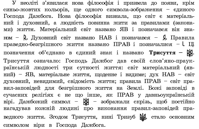 В неолите появилась новая философия и привела к появлению, кроме сине-желтых цветов, еще одного символа-изображения - единого Господа Дажбога. Новая философия признала, что мир есть материальный и духовный, а человечество должно жить по правилам (законам) жизни. Материальный мир назван ЯВ и обозначался он знаком - . Духовный мир назван НАВ и обозначался - Д. Правила праведно-безгрешной жизни названо ПРАВ и обозначались - І. Для обозначения объединили в единый знак и назвали Трисутствие - й|Д. Трисутствие означало: Господь Дажбог дал своей словяно-праукраинской человечеству три сущности жизни: мир материальный (явный) - ЯВ, материальная жизнь, ежедневная и видимая; дух НАВ - мир духовный, невидимый, сознание жизни; правила ПРАВ - мир правил-заповедей для безгрешной жизни на Земле. Божьи заповеди в современных религиях есть не что иное, как ПРАВ в древнеукраинской вере. Дажбожий символ - изображали повсюду, чтобы постоянно напоминал каждому человеку о выполнении правил-заповедей праведной жизни. Впоследствии Трисутствие, ныне Тризуб, стало основным символом веры в Господа Дажбога.