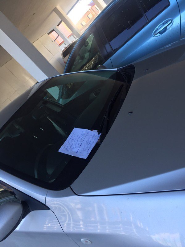 Неизвестный водитель припарковал свою машину словно король, заняв сразу два стояночных места. Отважная девушка изловчилась протиснуться задним ходом между двумя машинами, минуя опасно торчащую трубу. Автоледи возмутил наглый парковщик и она оставила ему "душевную" записку