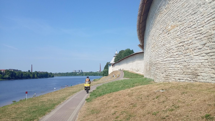 День 59 (Псковская область, г.Псков). Утром долго не зависаем, нас ждёт Псков. Закидываем пару бутербродов и пакуем вещи. Погода окончательно наладилась, и к озеру уже потянулись первые пляжники. Оставшиеся до города 25 километров проезжаем быстро.