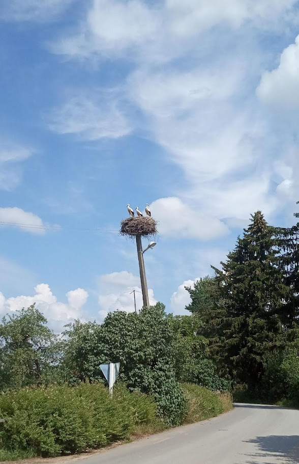 Первые двадцать пять километров едем отлично. Нормальная дорога, машин почти нет, даже попутный ветерок иногда ощущается. Одним словом, летим в своё удовольствие. Местность стала напоминать Беларусь. Луга и множество аистов. Особенно интересно наблюдать как они вышагивают рядом с косящим траву трактором, точно бригадиры, наблюдающие за ходом работ.