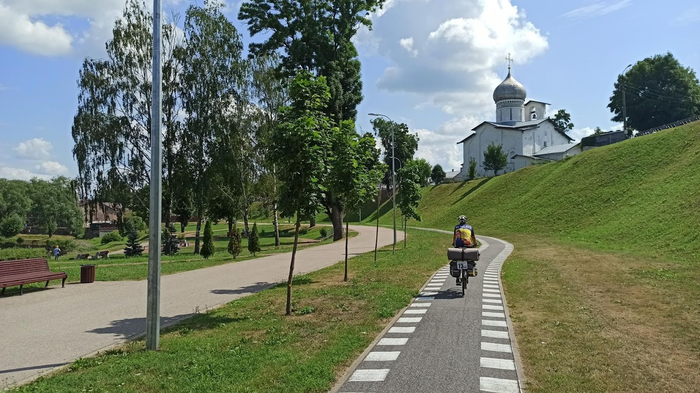 День 60 (Псковская область, г.Псков). На второй день решили не лениться и, помимо стирки и отдыха, всё-таки прошвырнуться немного по городу, тем более появилась необходимость прикупить Ирине хоть какие-нибудь грипсы на руль. Мягкие китайские с Али уже в первый день похода дали понять, что долго жить не собираются, а теперь пришли в полную негодность. На такси уехали в Спортмастер, а уже оттуда двинули пешком обратно, по дороге собирая местные интересности.