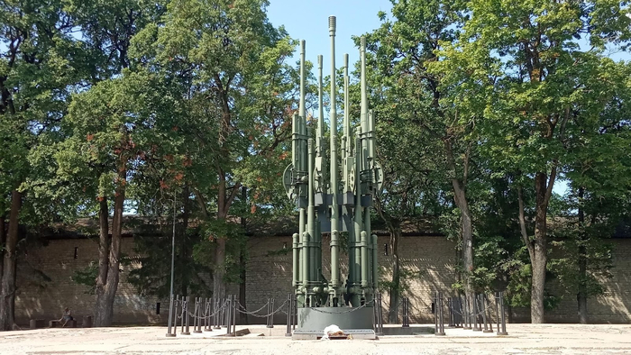 Рядом у трассы стоит модель "Катюши": выполнена она не очень, но что еще печальнее: на ней осталось всего три флага. Кстати, мимо по трассе проезжают латышские, чешские, венгерские, эстонские и польские фуры, возможно, размещение мемориала не в самой Идрице, а на шоссе, имело некоторый политический подтекст. А почему бы и нет?