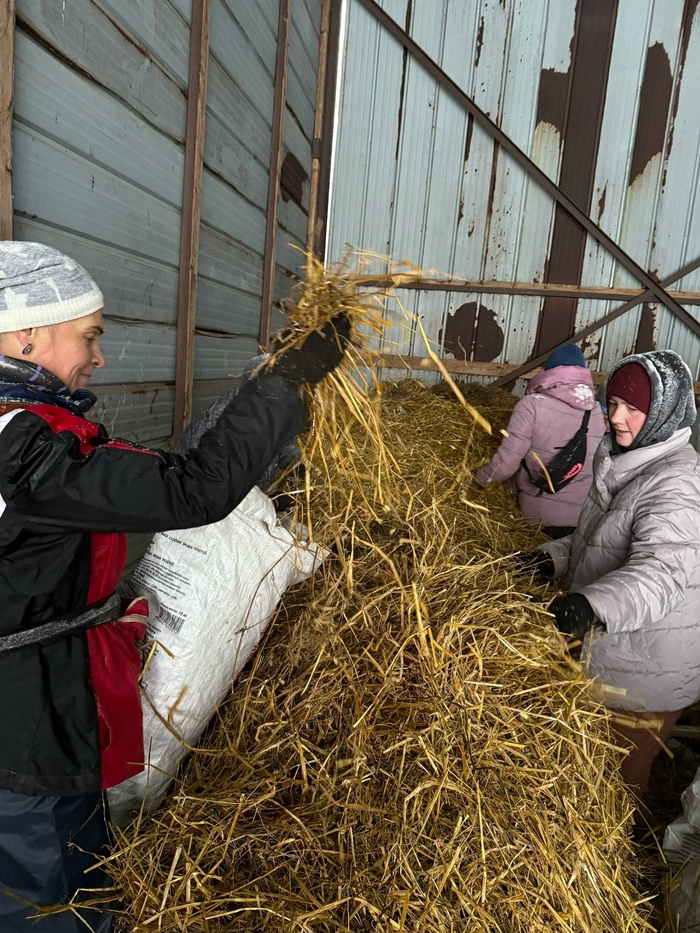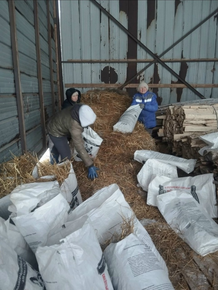 Ведь, гораздо удобней и быстрее в морозы разносить по вольерам уже готовую к раскладке солому в мешках, а не стоять на морозе, ковыряя огромные соломенные рулоны!