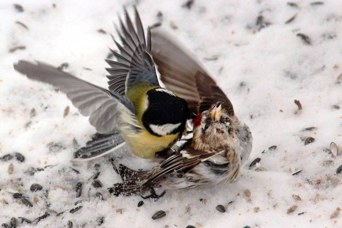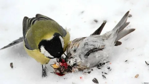 Но зимой проблема усугубляется – особенно, когда стоят сильные морозы. Голод заставляет синиц нападать на добычу покрупнее. В разных регионах эти пернатые головорезы выбирают себе разных жертв. На сегодняшний день официально задокументированы их регулярные нападения на чечёток, обыкновенных овсянок и мухоловок-пеструшек.
