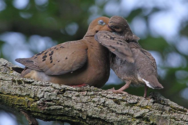 Что интересно: как и у млекопитающих, выработку "молока" у птиц запускает гормон пролактин, а вырабатывается оно как у самок, так и у самцов. Родители кормят птенцов прямо из клюва. Не очень удобно, а что делать? Зато всё по более упрощенной схеме, и очень даже эффективно в плане выращивания потомства.
