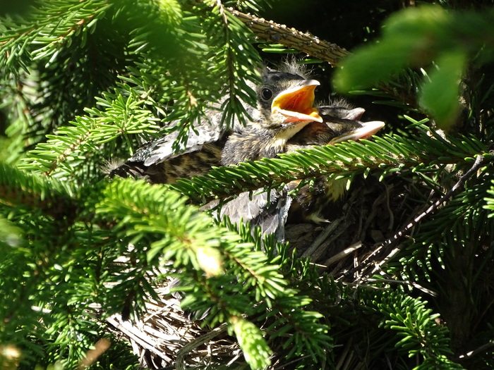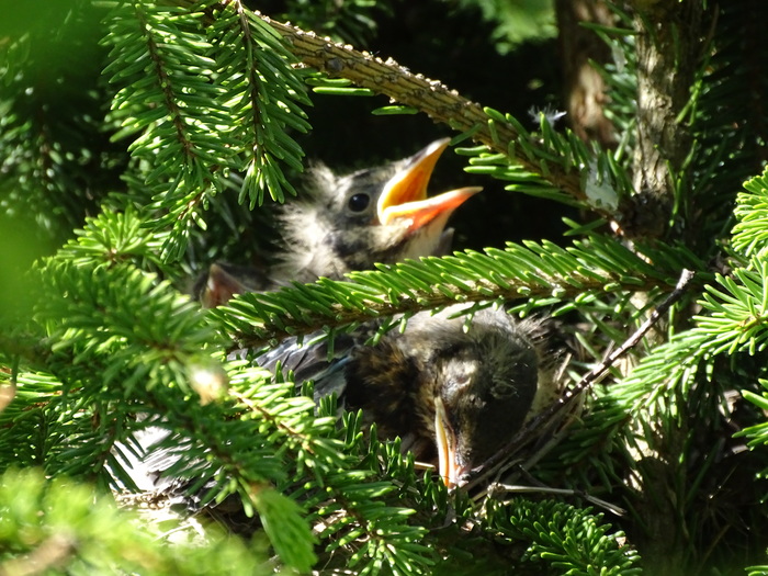 Птенцы дрозда-рябинника в гнезде. Правильный режим в жару: спать - есть - спать... ;)