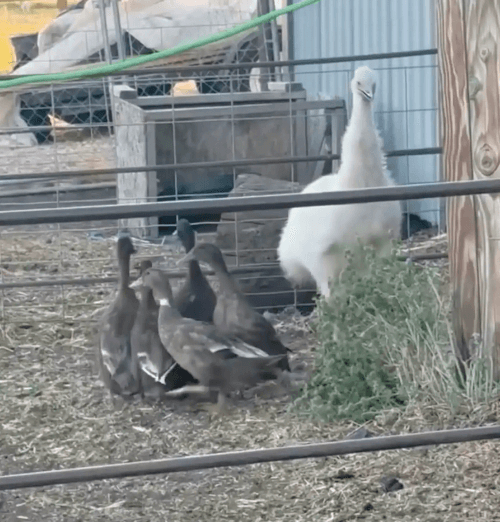 Так уж случилось, что Дейзи отставала в росте от собратьев, а потому хозяйка приняла решение временно изолировать её от других эму. Но поскольку птице всё-таки нужна была компания, Кейси подселила её к утятам (уток она также держит на ферме).