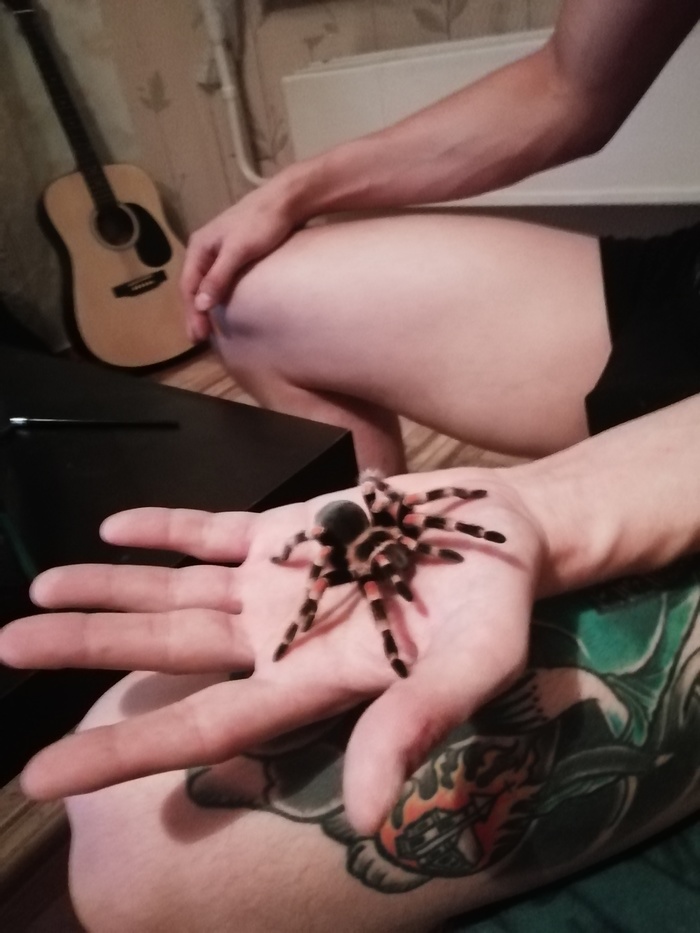 С питомцем мы определились, но почему-то всё откладывали покупку. То и дело находились более приоритетные цели, на которые тратились деньги. И вдруг на очередном тату сеансе общаясь с мастером, я узнал что в Омске таки есть чувак который держит пауков. Дальше я с ним связался, мы с девушкой посмотрели кто у него есть, почитали про эти виды, узнал стоимость (на птичьем рынке кстати цены раза в 3 больше) и приехал за паучком.