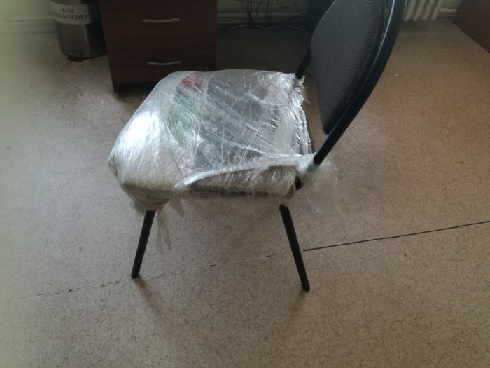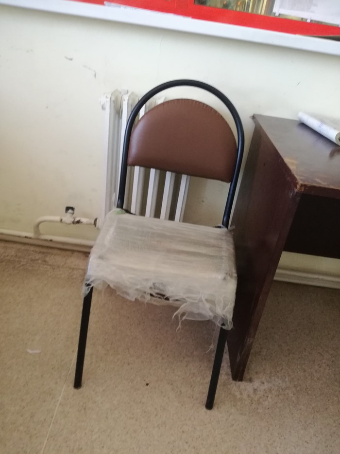 И так.. это стулья в кабинете, где работают кладовщики, ветарачи и операторы эвм...( К слову рабочая смена 12 ч., днем и ночью) , а это стулья трансформеры ( ну знаете,когда скелет стула один, а сидушка от другого стула, примотанные пленкой, чтобы хоть как то было сидеть).