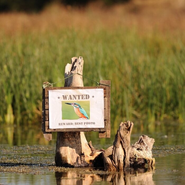 Доставив корягу к месту съемки и отканотовав её на несколько метров от берега, мы закрепили табличку и стала ждать реакции зимородка.