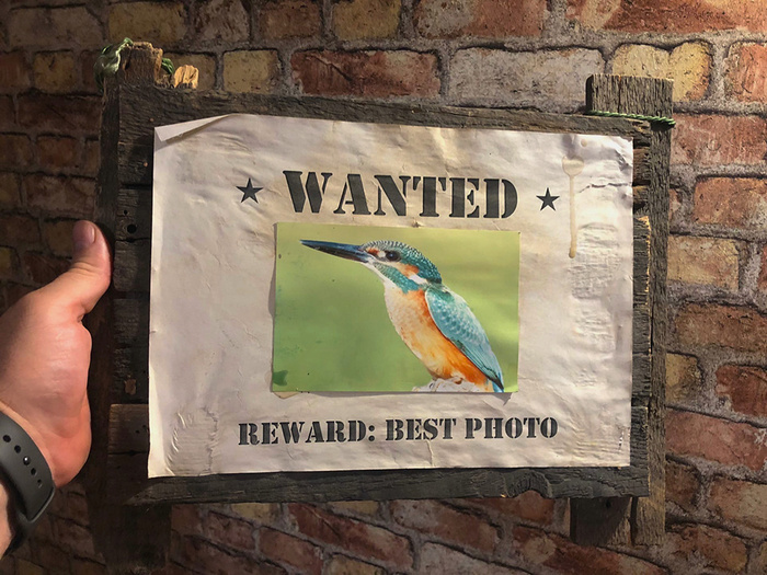 Саму табличку мы сделали из старого овощного ящика, а фото взяли этого же зимородка, снятое несколькими днями ранее.