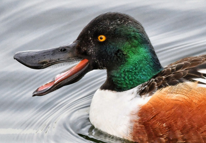"Улыбка" широконоски выглядит немного недобро, но на самом деле эти "зубы" не совсем зубы, это щетинки, через которые утка процеживает воду в поисках корма.