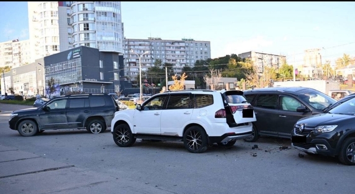 Внедорожник врезался в бордюр и протаранил четыре припаркованные у автомойки машины.