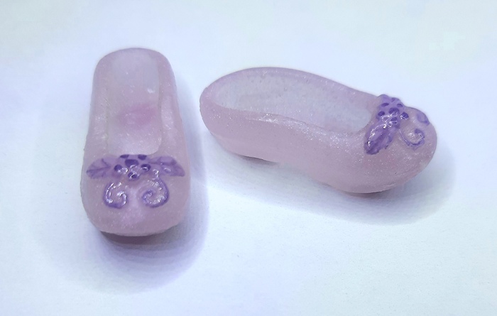 Обувь выполнена из эпоксидной смолы, путём литья в силиконовую форму. Мастер модель с фирменной обуви от компании Mattel (1 фото 1 столбец). Несмотря на то, что эпоксидной смоле характерна твёрдая структура при затвердевании, мне удалось добиться упругости изделия, свойственной резине.