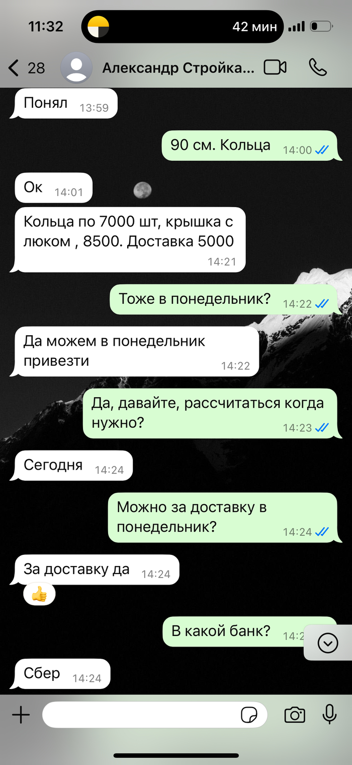В какой-то из понедельников мы ждали доставку материала и я решила через него купить ещё бетонные кольца и люк, ещё перевела ему 22500₽ и 6000₽ за доставку.