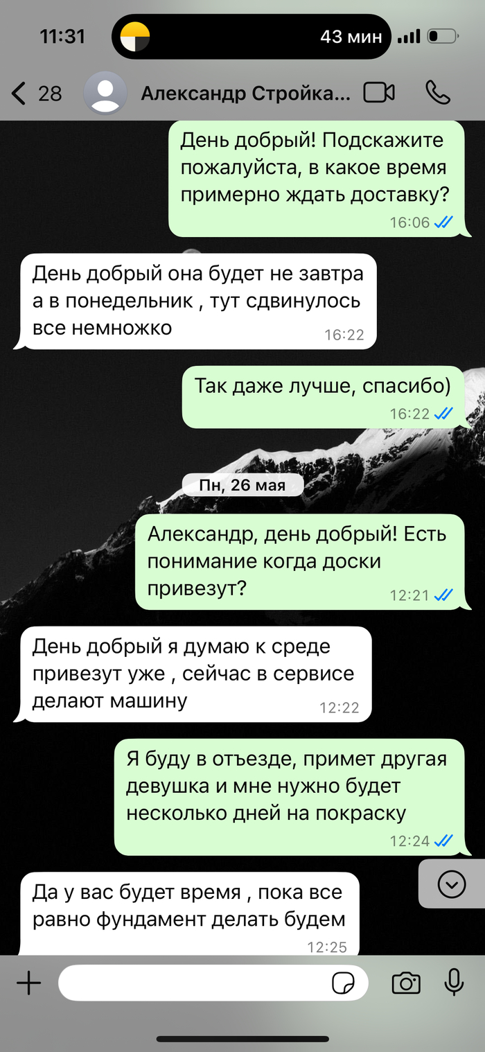 Меня всё устроило, далее он перезванивает, говорит о том, что послезавтра из Карелии пойдет машина с материалом и если мы завтра заключим договор, то стоимость материала будет дешевле на 15%.