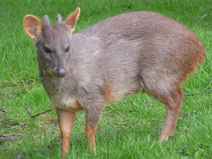 Как и у настоящих оленей самцы отращивают рога и каждый год их сбрасывают. Длина рожек обычно не более 6 см, но если вспомнить про 35-сантиметровый рост рогоносца, то не так-то оно и мало.