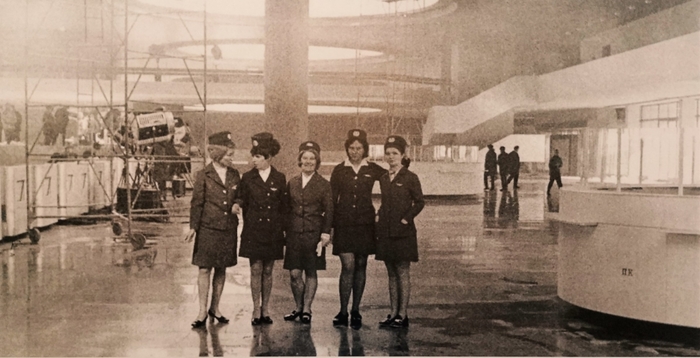 Стюардессы фотографируются на открытии Пулково-1. На заднем плане – прожекторы для съемки кинохроники.