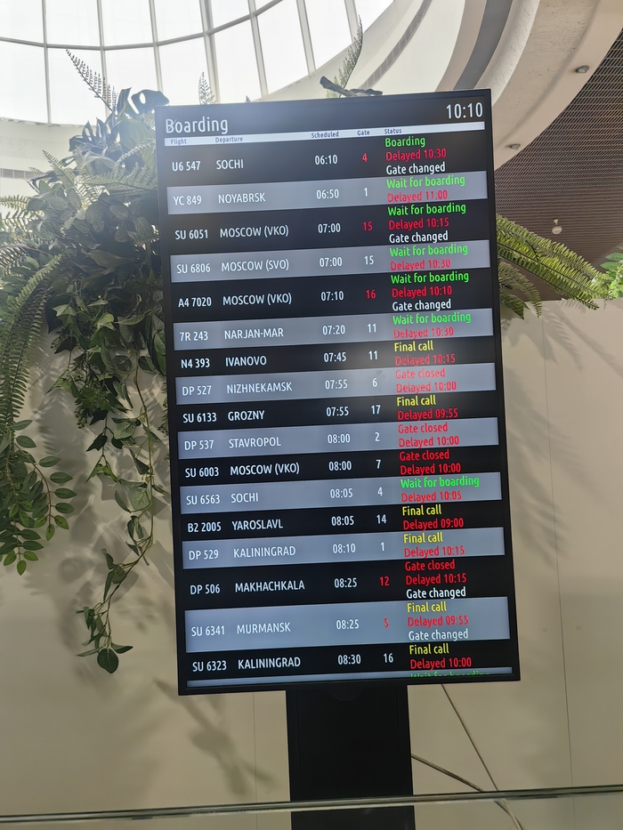Сегодня, 28 апреля 2025года, был объявлен план «Ковер» воздушное пространство над СПб и Ленинградской областью закрыли. Понятно, что в аэропорту тысячи не вылетевших пассажиров в зоне вылета. И в такие периоды перегрузки становятся явными ошибки «эффективных» ради оверприбыльности и наживы. На весь зал с 01-08 выход имеется всего одно табло информации о вылетах, но зато все пространство загромождено стойками с рекламой. Информация на табло обновляется не в соответствии с текущим временем. На сайте вообще работает все «по расписанию», т.е. актуально узнать какой у тебя сейчас выход можно только внимательно выслушивая информаторов. В общем все как всегда, прибыль все - для людей ничего. 🤷