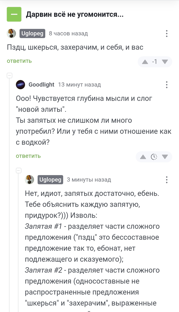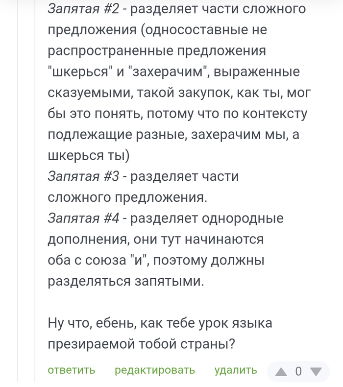 Урок русского языка для наших диванных оппозиционеров (правда, там реально третья запятая была лишней, но она всё равно объяснима и может быть поставлена). Печатаю анонимно, хотя за запятые пояснял я, в первый раз, посмотрим на реакцию.