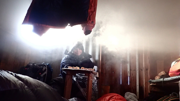 День провели в лежачем положении: просмотрели фотографии, покушали, сделали пару выходов на улицу и вновь легли в спальниках в избе.