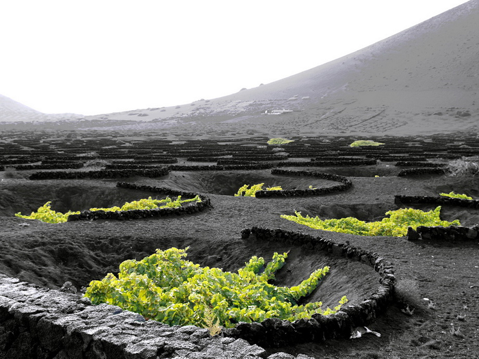 Виноград выращивают на местный "вулканический" манер: делают специальные ямки в пепле (а увлажнение происходит благодаря конденсату на стенках этих штуковин). Выглядит чуднО.