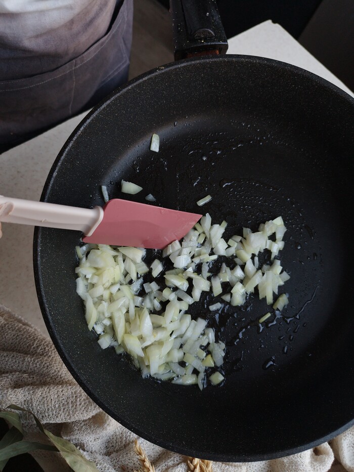 3. Мелко режем и обжариваем на капле растительного масла лук до золотистого цвета.