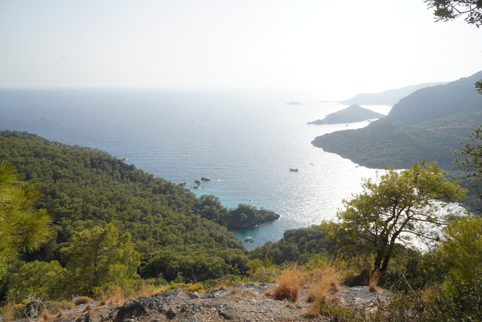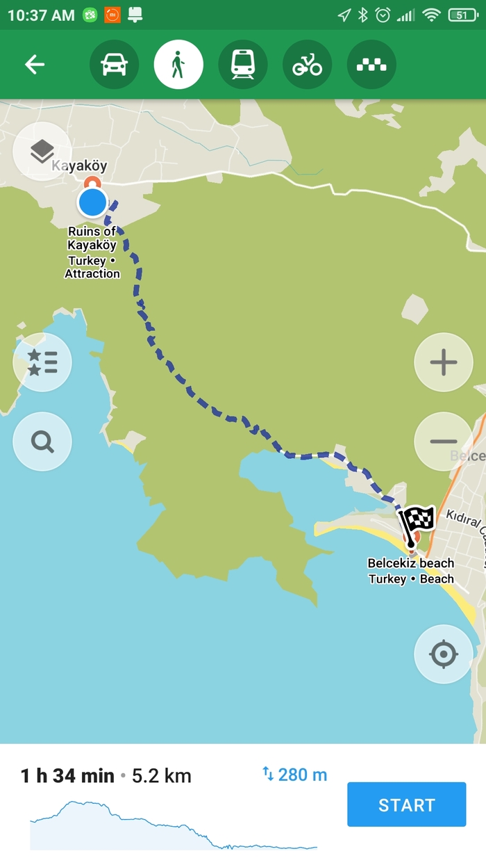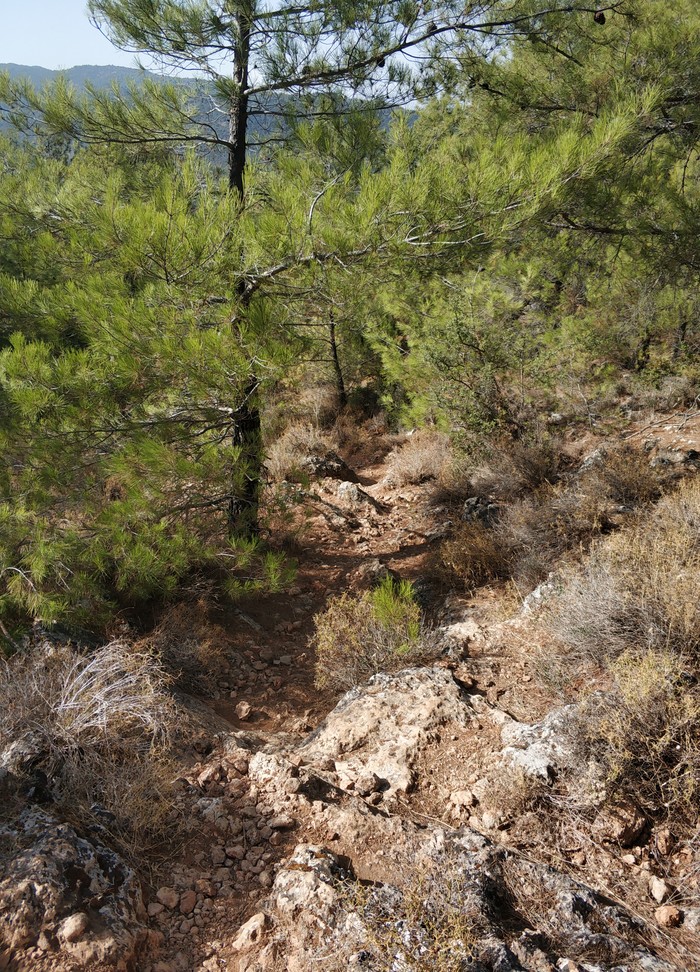 Из Каякёя до пляжа в поселке Олюдениз можно добраться через гору. Весь путь займёт чуть больше 2 часов (5.2 км). Хоть тропа и кажется дикой, там много направляющих меток на камнях и деревьях.