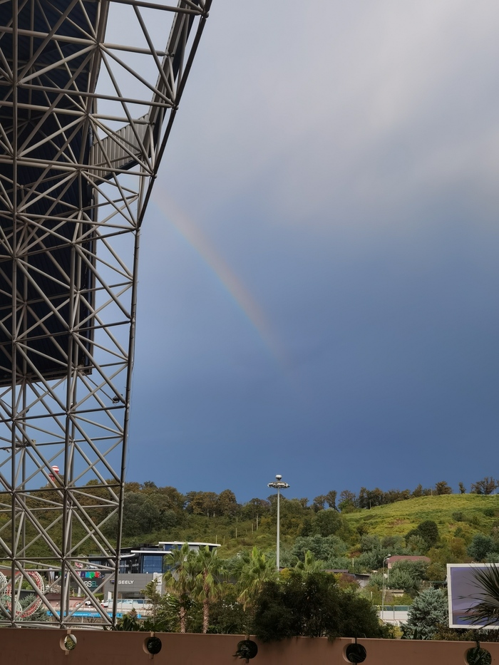 Вышли на улицу. Было немного прохладно и небо затянуто плотными серыми тучами, но видна радуга. Хоть что-то хорошее. Подумали над предстоящим днем, ещё немного подремали на улице, а проснувшись решили ехать в город. Около 40 минут ждали автобус и в 8:30 выехали.
