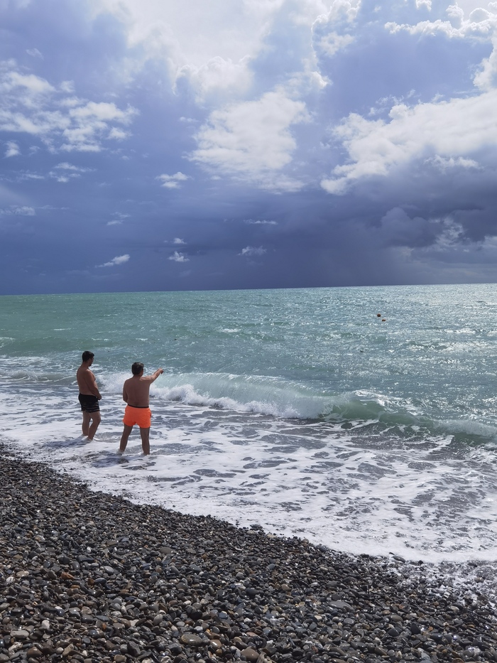 Изначально задумывали проверить кемпинг на пляже недалеко от границы с Абхазией. Просто ради интереса. Однако, когда мы вышли на ближайший пляж, увидели, что бушует шторм. Ясно, что не самый сильный в природе и на этой местности, но мы таких волн ещё не видели. Так что решили посидеть и просто полюбоваться мощью воды.