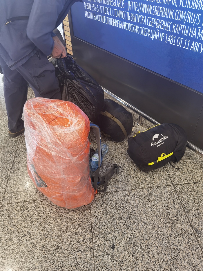 В 14:20 были в аэропорту. Регистрации на рейс ещё нет, так что мы пошли спокойно распределять вес по рюкзакам. Получилось. Легче было в том числе из-за разницы температур в Сочи и Красноярске. Мы надели на себя кучу одежды, основательно утеплившись. Но все равно, по весу было впритык. Шутила, что если нацепят на рюкзак бирку, то будет перевес.