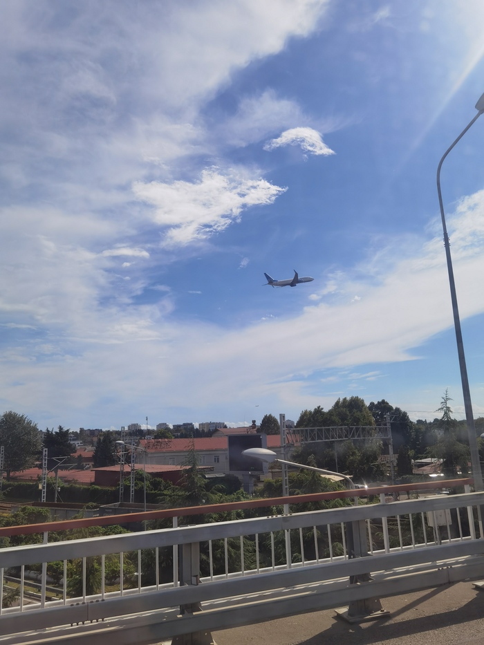 Снова пошел дождь. Пропустили один автобус, потому что на 2гис шел более подходящий и уже вот-вот должен был подъехать. Однако, вот показывает, что он проезжает нашу остановку, но на самом деле его нет! Это был просто призрак. Сели сразу на другой и... Шик... Дорогу перекрыли! Оказывается, в аэропорт нужно попасть более важному человеку, чем мы все. Стоим, ждём, пока проедет президент. Просто замечательно. Так вот, почему столько патрульных. Наконец, проезжает куча тонированных черных машин с мигалками. Вот кто точно успеет на самолёт...
