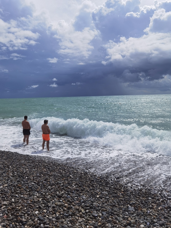 Никто, собственно, и не купался. На заднем фоне угрожающие темные тучи и виднелась явная тень дождя. А мы сидели и созерцали. Невозможно оторваться. Все лицо соленое от брызг, но довольное и завораженное. А кто-то сидел ниже каменистого гребня, совсем не побоявшись, что его утащит очередная сильная волна, даже когда та била их в лицо. А некоторые позволяли спускаться туда своим детям или же сами родители спускались с младенцами на руках. Может они не видели тех видео, где людей будто засасывает в море все дальше, хотя изначально те были на берегу? А может это я такая паникерша?