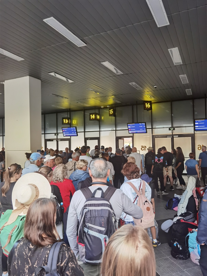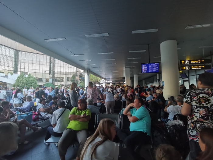 По наступлении времени посадки к нужным воротам уже вастроилась массивная очередь, занимающая все пространство под козырьком и ещё столько же по длине на территории двора. Мы решили подождать. А посадку всё не объявляют при том, что нет никакой информации о задержке рейса.