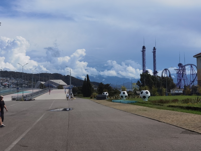 После завтрака пошли исследовать опустевшие территории. Перешли через мост, увидели Диснейленд, который на самом деле Сочи парк. Прошли мимо, потому что явно это платная тема, а значит не для нас. Насладились красотой зданий со стороны и пошли на ближайший пляж.