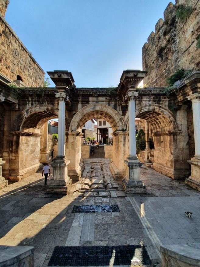 Поселился в недорогом хостеле в исторической части Антальи. Войти в центр города можно через живописную свежеотреставрированную арку. Ворота эти построены ещё в Античные времена, в период правления римского императора Адриана. Хорошо сохранившаяся историческая часть любого города — это всегда здорово и прекрасно. Помимо этого они почти всегда очень хорошо обустроены под нужды туристов: на каждом шагу можно поесть и выпить, а местные заведения стараются не нарушать своим внешним видом атмосферу старины.