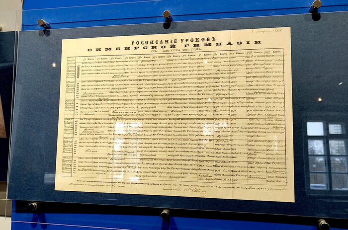 Есть небольшое сомнение, что представленная в витрине книга – мемориальная. По крайней мере, акцента, что она точно хранилась в семье Ульяновых и в конечном итоге оказалась в музее, в этикетке нет. Но похвальный лист точно настоящий, с подписями преподавателей, инспектора и, главное, директора гимназии Керенского.