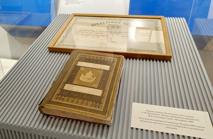 Витрина озаглавлена как «Первая награда». Володя Ульянов по окончании третьего класса в июне 1882 года получил похвальный лист и второй том географических рассказов «Жизнь европейских народов» детской писательницы Елизаветы Водовозовой. Неплохой подарок, я вот в детстве очень любил познавательные энциклопедии с картинками, а здесь такие есть. Интересный факт: Водовозова – близкий к революционному движению деятель, активная участница кружков 1860-х годов, мать народнического публициста и члена партии трудовиков Василия Водовозова.