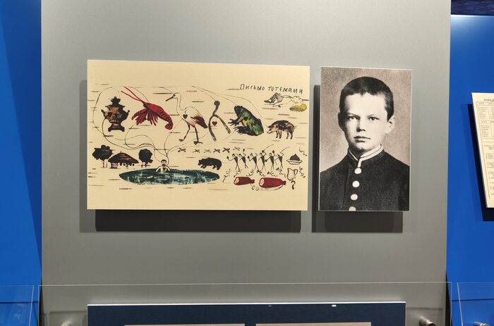 Тут, естественно, копия, но зато какого документа... Это знаменитое «письмо тотемами», которое 12-летний Володя Ульянов отправил своему другу по гимназии и сверстнику Борису Фармаковскому. Боренька представлен на фото справа. Семья Фармаковских в 1881 году переехала в Оренбургскую губернию, отчего приятелям приходилось переписываться.