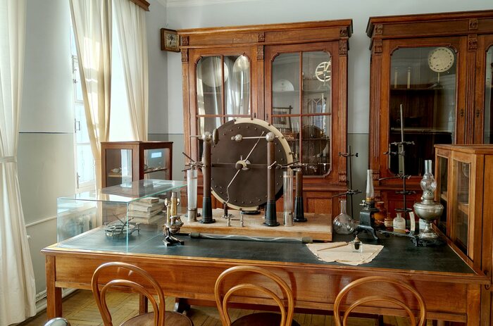 Когда занятия требовали особого помещения, класс перемещался из собственной аудитории в специальный кабинет. Пример его обстановки показывает третий мемориальный зал – физический кабинет. Он был одним из лучших среди гимназий Казанского учебного округа и насчитывал более двух сотен приборов. Сейчас в кабинет музейщики насобирали более сотни исторических приборов, а заодно книги и коллекцию минералов.