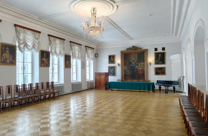 Поднимемся на второй этаж и посмотрим на этот зал своими глазами. Актовый зал реконструирован по документам, фотографиям и воспоминаниям и украшен копийными портретами – настоящие были утрачены во время революции. Оно и понятно: целая галерея царей и императоров явно бы не понравилась победившим пролетариям.
