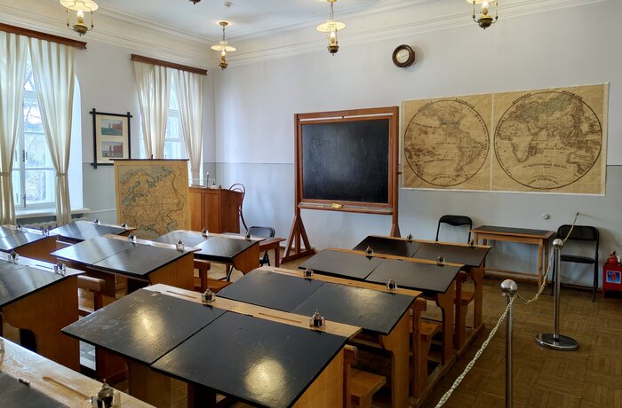 Всего на втором этаже три мемориальных зала. После актового идём в классную комнату седьмого класса. Нам привычнее, что кабинеты в школах привязаны к учителям и предметам, а не к классам, но до революции было иначе. Ленин оказался в этом классе в 1885/1886 учебном году.