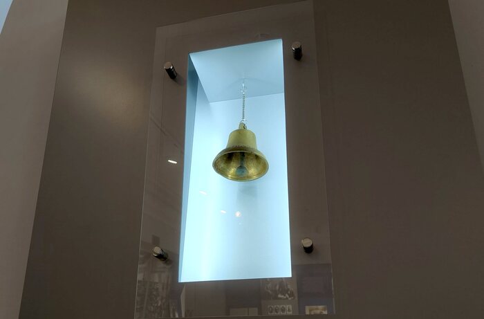 Первый этаж занимает современная экспозиция 2020 года, где компактно рассказано в классическом виде об истории дореволюционной гимназии. Есть любопытные экспонаты. Например, на этом фото в витрине висит колокольчик, которым во второй половине XIX столетия давались звонки на уроки и перемены. На колокольчике надпись: «Кого люблю, того бодрю». Смешно.