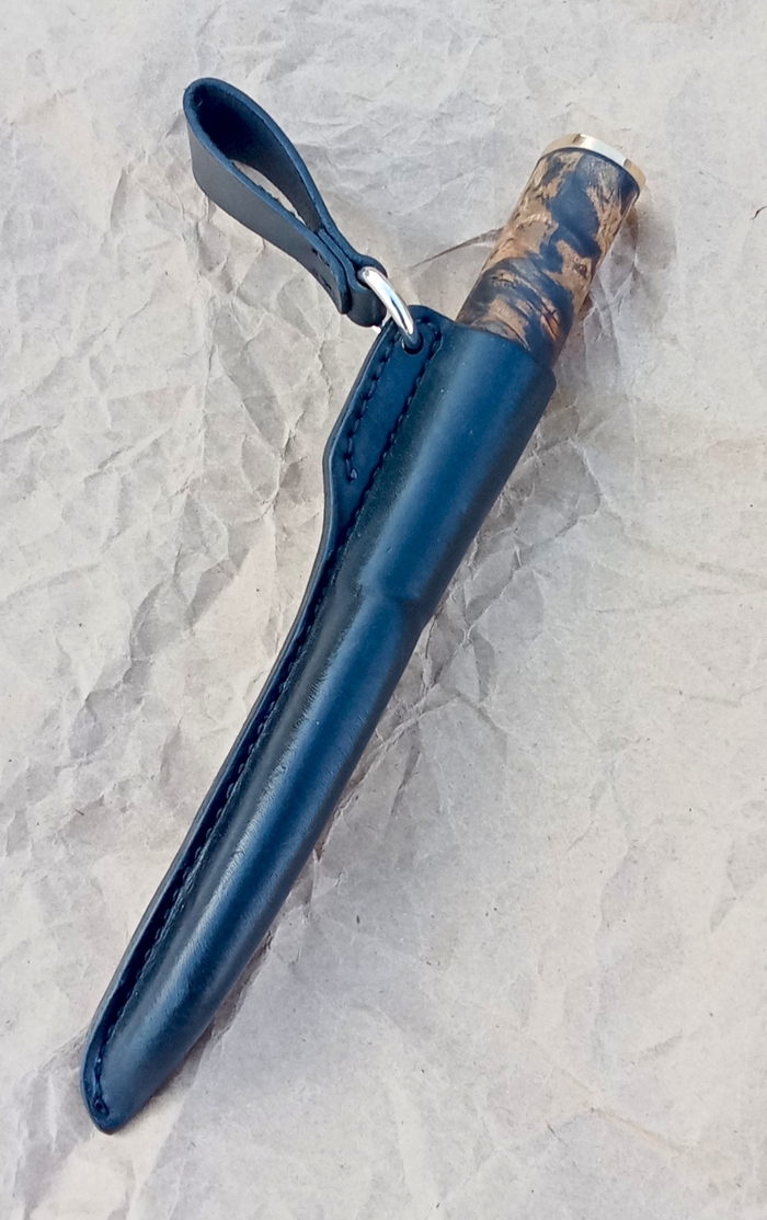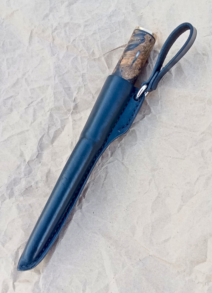 Рукоять карельская береза, полимер, мельхиор, гравировка, окраска. Покрытие: масло, воск.