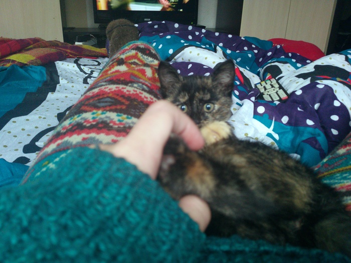 Знакомьтесь, дерзкая, как понос, но очень милая крошка-кошка. В комплекте черный и кремовый носочки на передних лапках. Дерется с пакетом, шипит на местных котогопников, однако ходит в лоток и спит с нами, так что всё ок :)