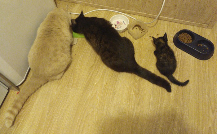 Взаимные шипенья прекратились, лоток поделен, территория дивана временно захвачена малой, старшие жрут корм младшей, она зарится на их миски, в общем, все как всегда :) В основном, Пуля пытается играть с дедами: Пуфик терпит, Пушинка отчаянно лупит новоиспеченного духа.