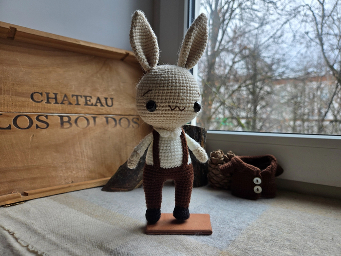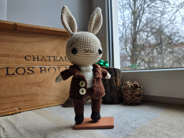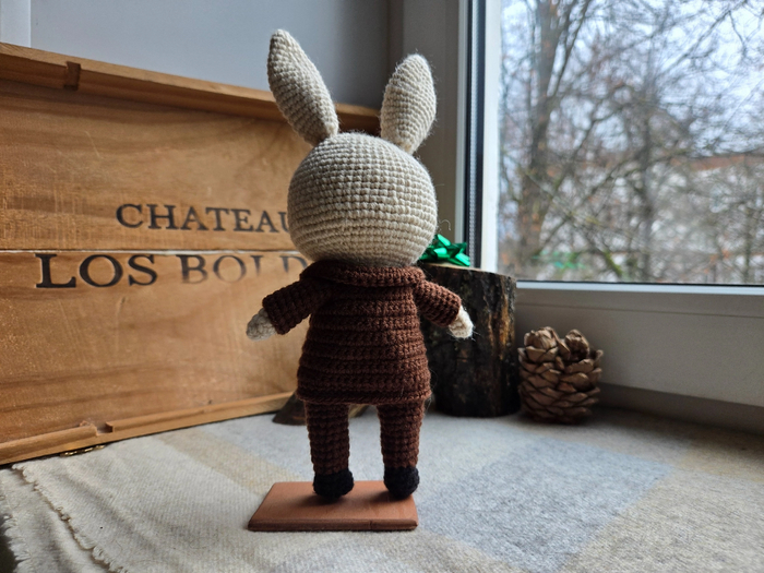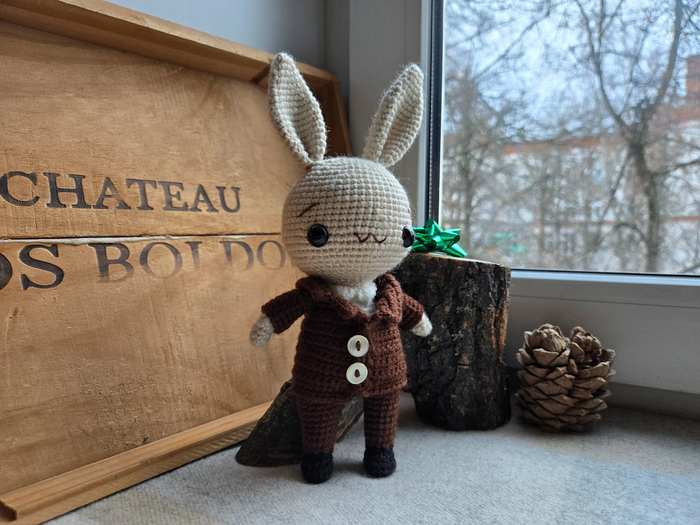 Первым я начала вязать зайчика, так как он показался мне проще в исполнении. На работу ушло примерно два дня, но я часто отвлекалась на домашние дела, связанные с подготовкой к Новому году. Проблем с зайчиком практически не возникло, и я особенно горжусь его манжетами и воротничком. А вот пуговки на пиджаке... возможно, их можно было сделать лучше 😅 (не самый гордый момент).