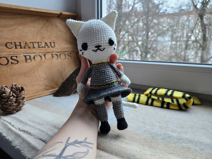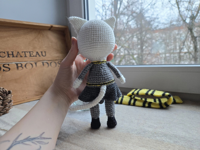 После зайчика я приступила к кошечке. Голову я связала ещё вместе с зайчиком, но к телу вернулась только через пару дней и закончила его буквально за половину стрима DK. Хотелось сделать её максимально детализированной: ботиночки, чулочки, юбочка, свитер... я даже сделала хвост на проволоке!